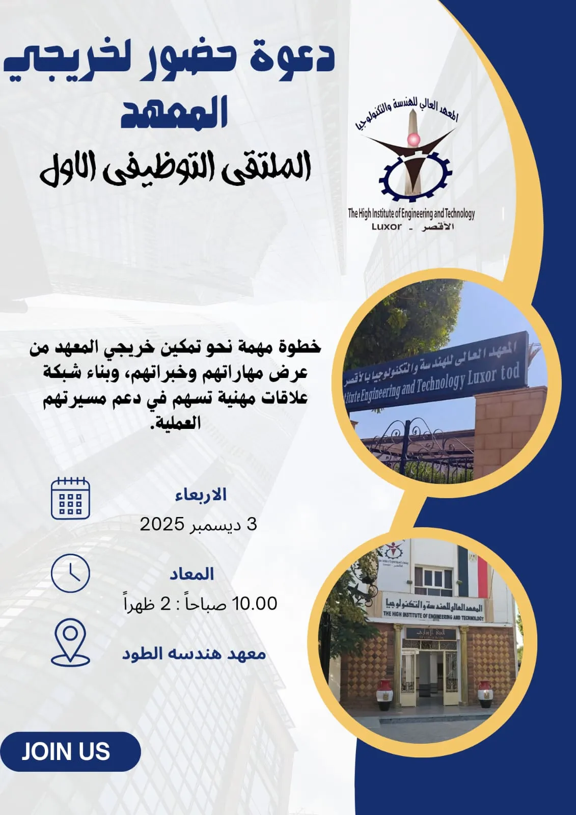يسر إدارة المعهد العالي للهندسة والتكنولوجيا بالأقصر أن تدعو أبناءها الخريجين لحضور “الملتقى التوظيفي الأول”. يأتي هذا الملتقى كخطوة جوهرية نهدف من خلالها إلى دعم مسيرتكم المهنية، وتوفير منصة مثالية تمكنكم من عرض مهاراتكم وخبراتكم، بالإضافة إلى بناء شبكة علاقات مهنية فعالة مع كبرى الجهات والشركات.