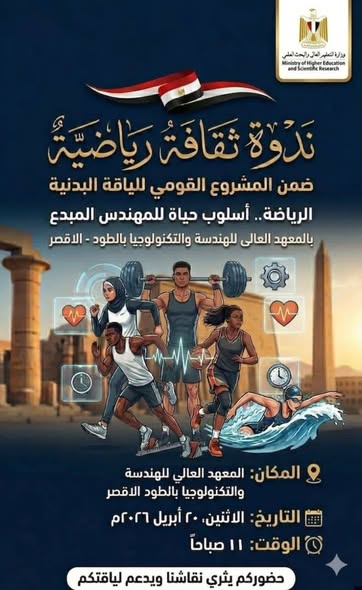 يتشرف المعهد العالي للهندسة والتكنولوجيا بالطود بالأقصر، بدعوة أبنائه الطلاب والطالبات لحضور الندوة التثقيفية الهامة بعنوان: “الرياضة.. أسلوب حياة للمهندس المبدع” تأتي هذه الندوة ضمن فعاليات المشروع القومي للياقة البدنية، وتحت رعاية الأستاذ الدكتور محمد الرملي حسين رئيس مجلس إدارة المعهد، وبالتعاون مع نخبة من المتخصصين لتعزيز الوعي الصحي والبدني …